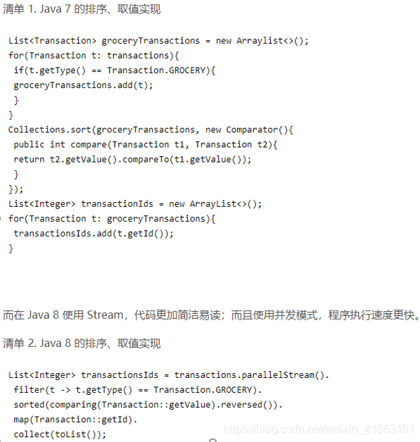 package com.lambda.usebean;/** * 实体类Person * @author MingChenchen * */public class Person { private String name; //姓名 private String location; //地址 public String getName() { return name; } public void setName(String name) { this.name = name; } public String getLocation() { return location; } public void setLocation(String location) { this.location = location; } @Override public String toString() { // TODO Auto-generated method stub return "Person:" + name + "," + location; }}//使用String默认的排序规则,比较的是Person的name字段Comparator byName = Comparator.comparing(p -> p.getName());//不用写传入参数,传入的用Person来声明Comparator byName2 = Comparator.comparing(Person::getName); //原本的for-each循环写做法List list = Arrays.asList(....);for (int i = 0; i < list.size(); i++) { System.out.println(list.get(i));}//使用lambda表达式后的写法list.forEach(str -> System.out.println(str));list.forEach()是JAVA8的新方法,支持函数式编程,此处使用的参数就是JAVA提供给我们的函数式接口:Consumer< T>interface List extends Collection interface Collection extends Iterable public interface Iterable { default void forEach(Consumer action) { Objects.requireNonNull(action); for (T t : this) { action.accept(t); } }} //普通写法:Listpeople = ...Collections.sort(people, new Comparator () { public int compare(Person x, Person y) { return x.getLastName().compareTo(y.getLastName()); }})//使用lambda表达式写法:people.sort(comparing(Person::getLastName));化简流程:第一步:去掉冗余的匿名类Collections.sort(people,(Personx, Person y) -> x.getLastName().compareTo(y.getLastName()));第二步:使用Comparator里的comparing方法Collections.sort(people, Comparator.comparing((Person p) -> p.getLastName()));第三步:类型推导和静态导入Collections.sort(people, comparing(p -> p.getLastName()));第四步:方法引用Collections.sort(people, comparing(Person::getLastName));第五步:使用List本身的sort更优people.sort(comparing(Person::getLastName));;