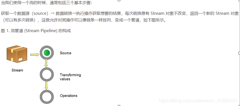 Stream 不是集合元素,它不是数据结构并不保存数据,它是有关算法和计算的,它更像一个高级版本的 Iterator。原始版本的 Iterator,用户只能显式地一个一个遍历元素并对其执行某些操作;高级版本的 Stream,用户只要给出需要对其包含的元素执行什么操作,比如 “过滤掉长度大于 10 的字符串”、“获取每个字符串的首字母”等,Stream 会隐式地在内部进行遍历,做出相应的数据转换。
