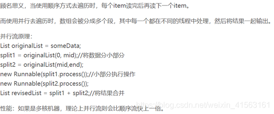 而和迭代器又不同的是,Stream 可以并行化操作,迭代器只能命令式地、串行化操作。顾名思义,当使用串行方式去遍历时,每个 item 读完后再读下一个 item。而使用并行去遍历时,数据会被分成多个段,其中每一个都在不同的线程中处理,然后将结果一起输出。Stream 的并行操作依赖于 Java7 中引入的 Fork/Join 框架(JSR166y)来拆分任务和加速处理过程。Java 的并行 API 演变历程基本如下: